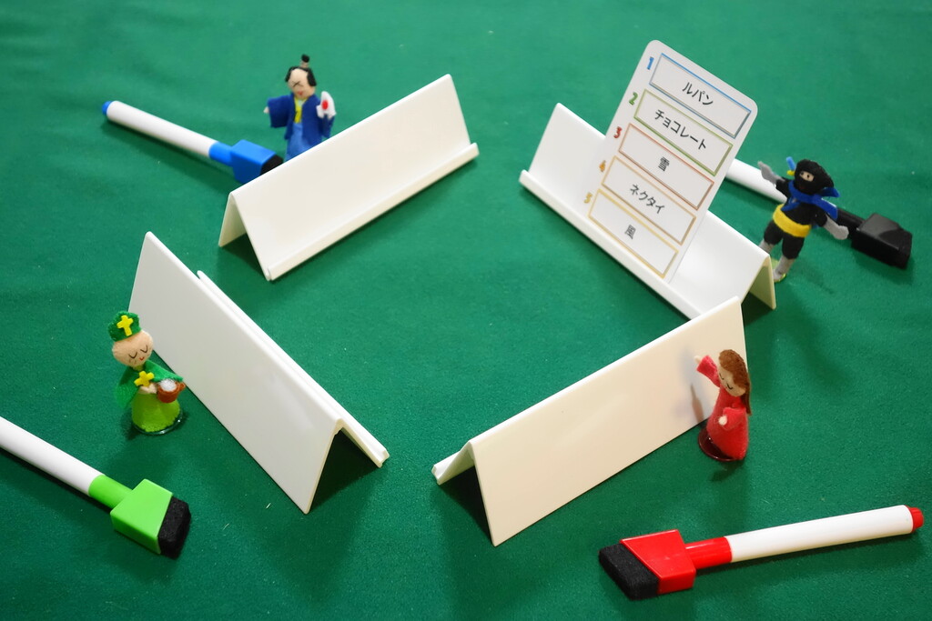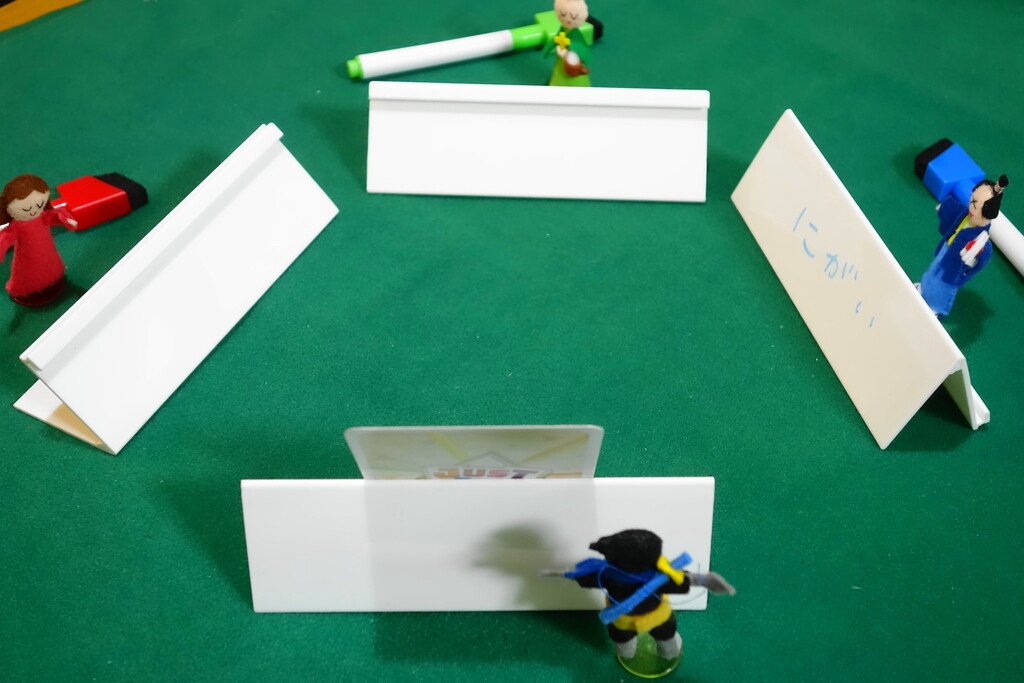 ²óÅú¼Ô¤Ï¤³¤ì¤é¤Î¥«¡¼¥É¤ò¼«Ê¬¤«¤é¸«¤¨¤Ê¤¤¤è¤¦¤ËÀè¤Û¤É¤Î¥×¥ì¡¼¥È¤ËΩ¤Æ¤Æ¡¢1¡Á5ÈÖ¤òÁª¤Ö¤³¤È¤Ç¡¢²óÅú¼Ô¤¬¤½¤Î¸ÀÍդΥҥó¥È¤ò½ñ¤¯¤Ã¤ÆÎ®¤ì¤ß¤¿¤¤¡£¤Ê¤Î¤Ç¡¢¥«¡¼¥É¤Ë¤É¤ó¤Ê¸ÀÍÕ¤¬½ñ¤¤¤Æ¤¢¤ë¤Î¤«¤ò¾Ò²ð¤Ç¤¤Ê¤¤¤ï¡ª